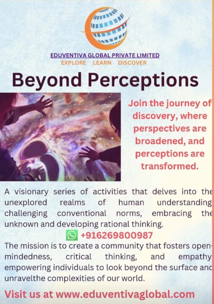 Beyond Perceptions is an empowering program by Eduventiva Global Private Limited that fosters rational thinking, personal growth, and effective decision-making. Through thoughtfully designed activities, we provide participants with valuable insights to strengthen their cognitive abilities and support personality development. Each session of Beyond Perceptions is crafted to inspire transformative thinking and equip individuals with the skills to navigate complex challenges confidently.
